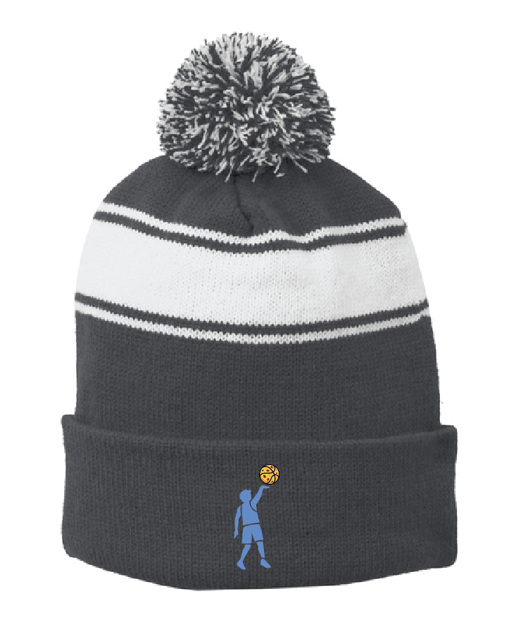 A fan fave: a classic beanie with three stripes and a two-tone pom.